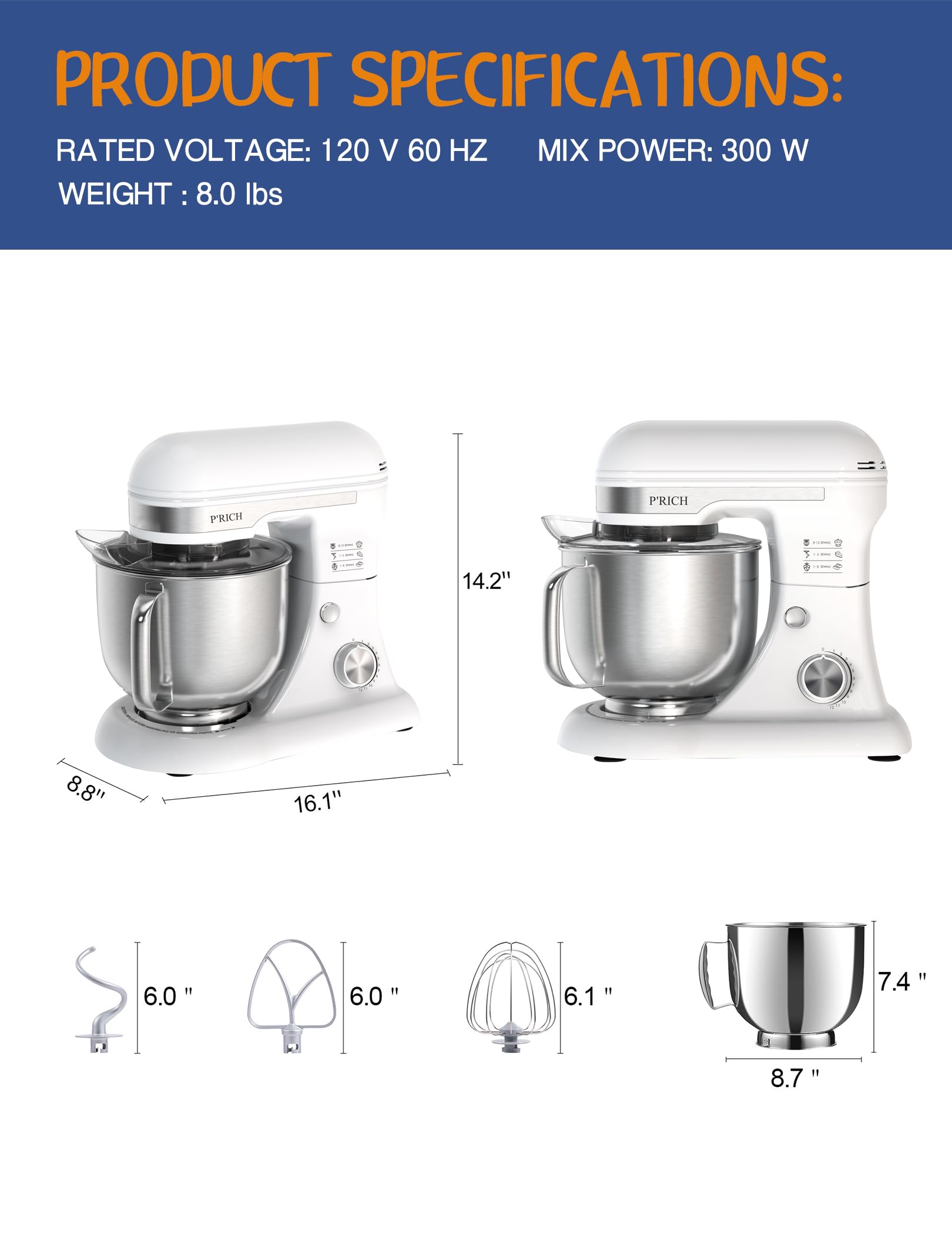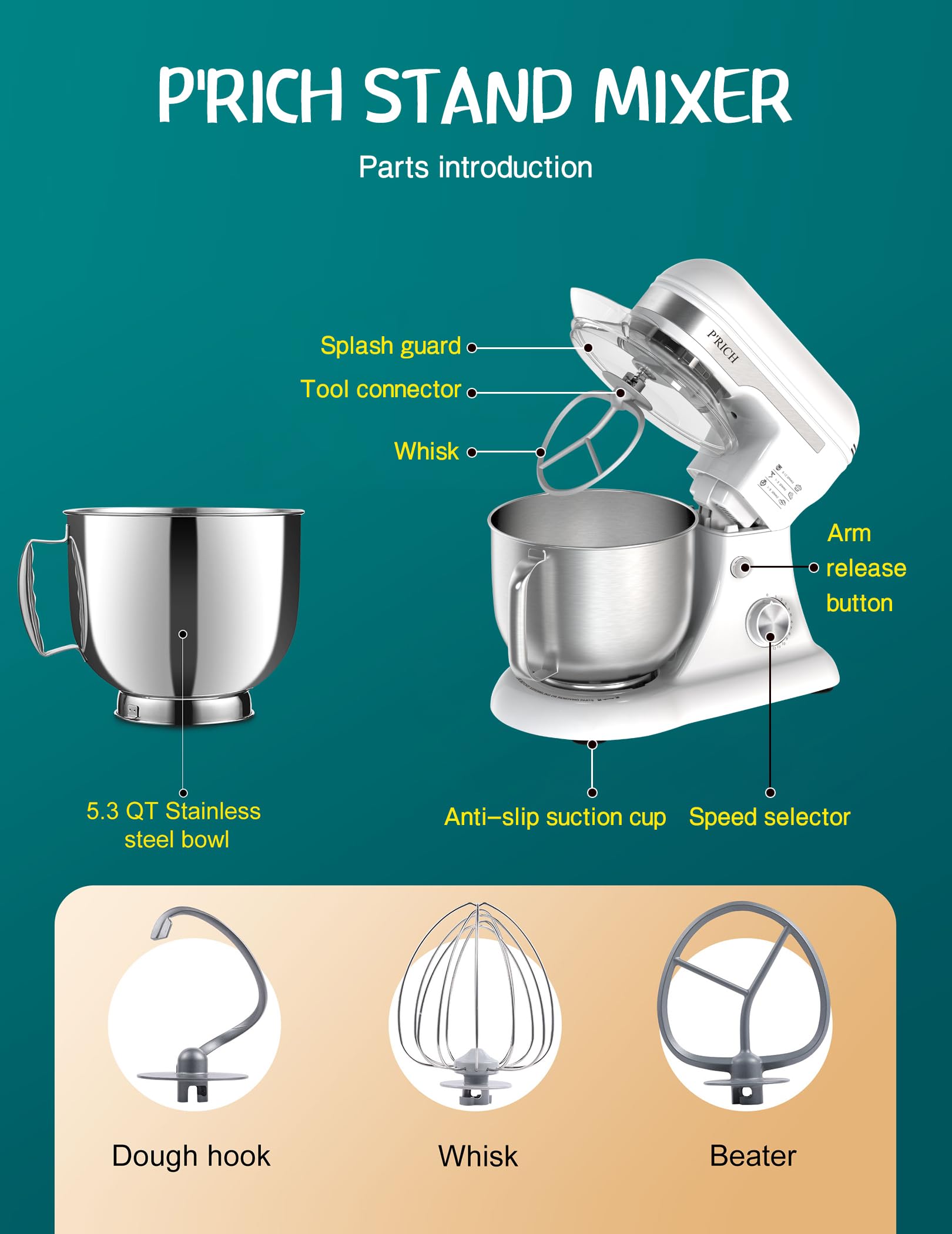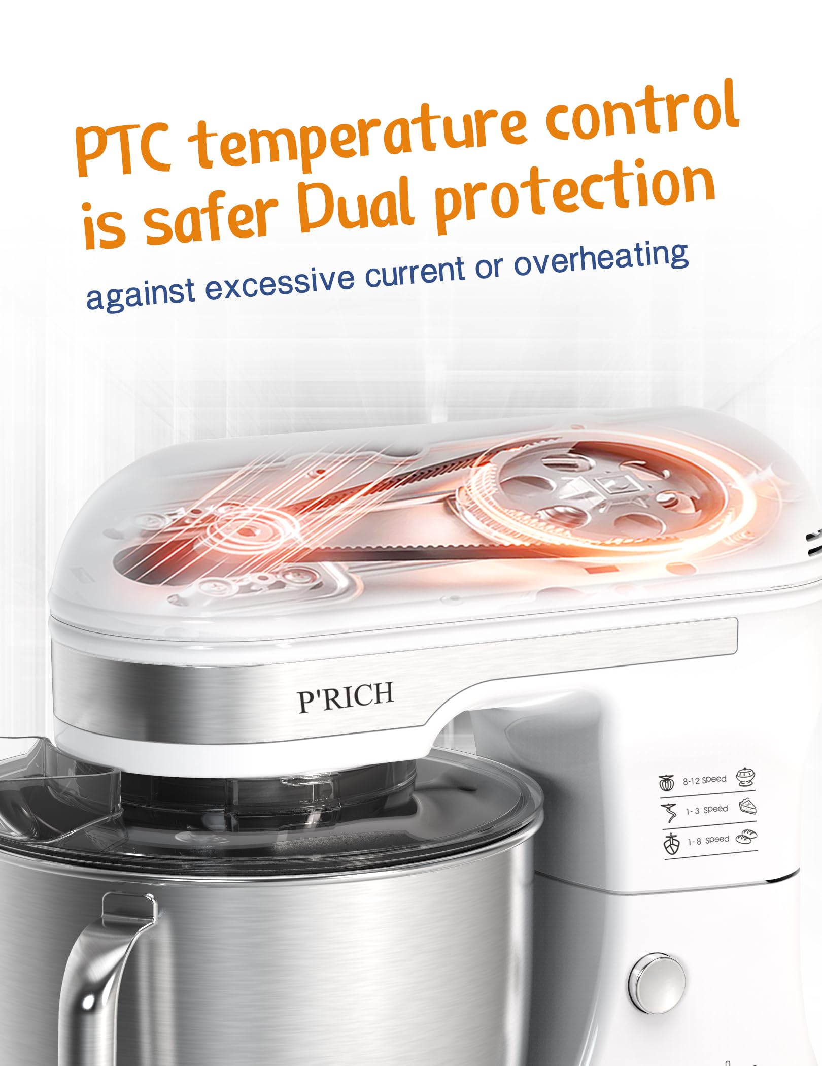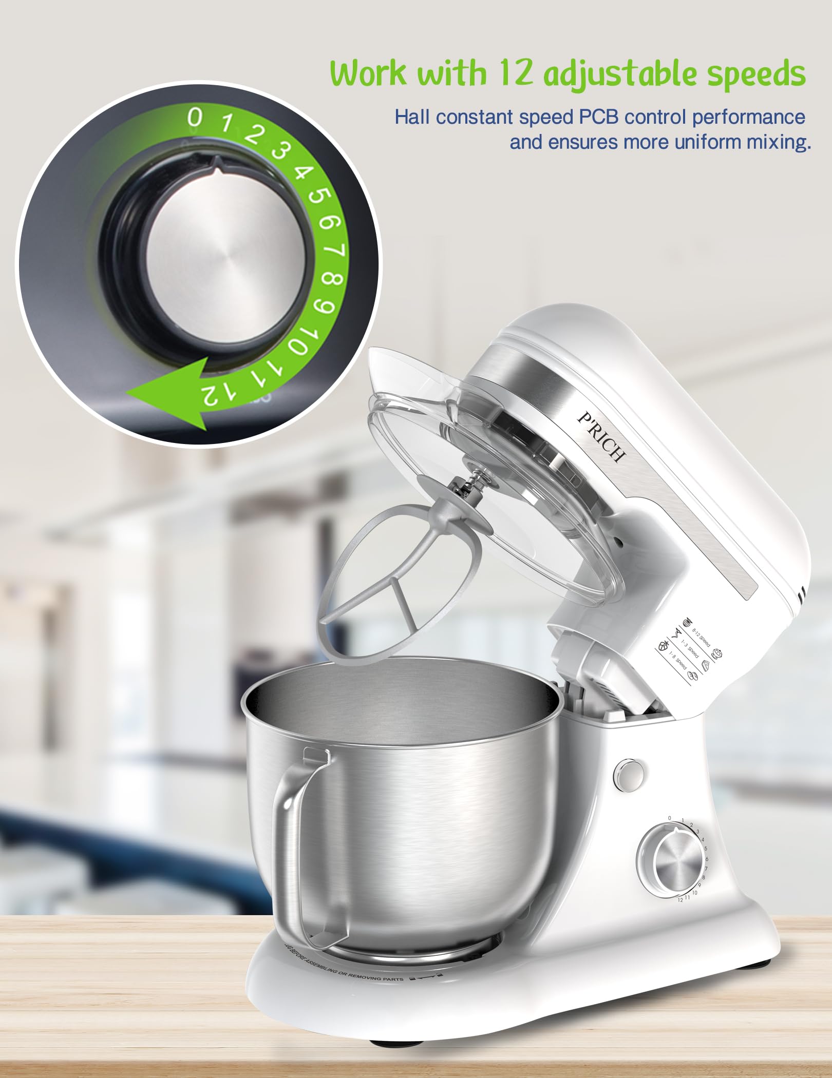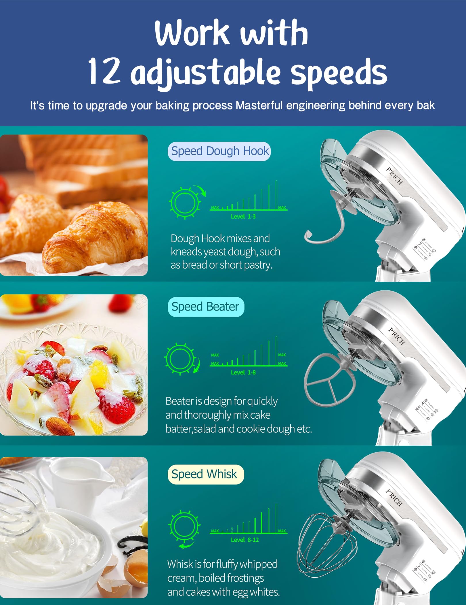 - VERSATILE & EFFICIENT:P'RICH kitchen mixer boasts a multitude of functions . Featuring 12 speed settings ranging from gentle stirring to high-speed blending - making it a powerful ally for all your culinary endeavors,such as, cakes, bread, cookies, pastry, muffins, and waffles.