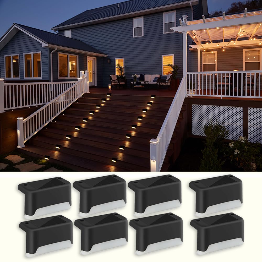 - ENHANCED SAFETY AND AESTHETIC: Elevate the safety and aesthetic appeal of your outdoor area with our solar deck lights outdoor waterproof. Emitting a warm white glow, these solar-powered deck lights not only illuminate your space but also ensure safe navigation for your entire family during nighttime activities. Whether it's lighting up your front door, driveway, or outdoor wall, these solar deck lights for outside add a touch of elegance while enhancing visibility.