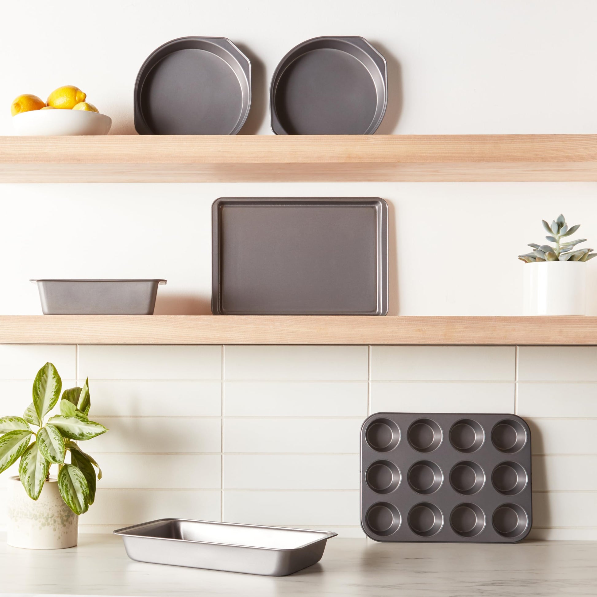 - 6-piece bakeware set includes a 9 x 5-inch loaf pan, 2 round 9-inch cake pans, a 12-cup muffin pan, a 13 x 9-inch roast pan, and a 13 x 9-inch baking sheet