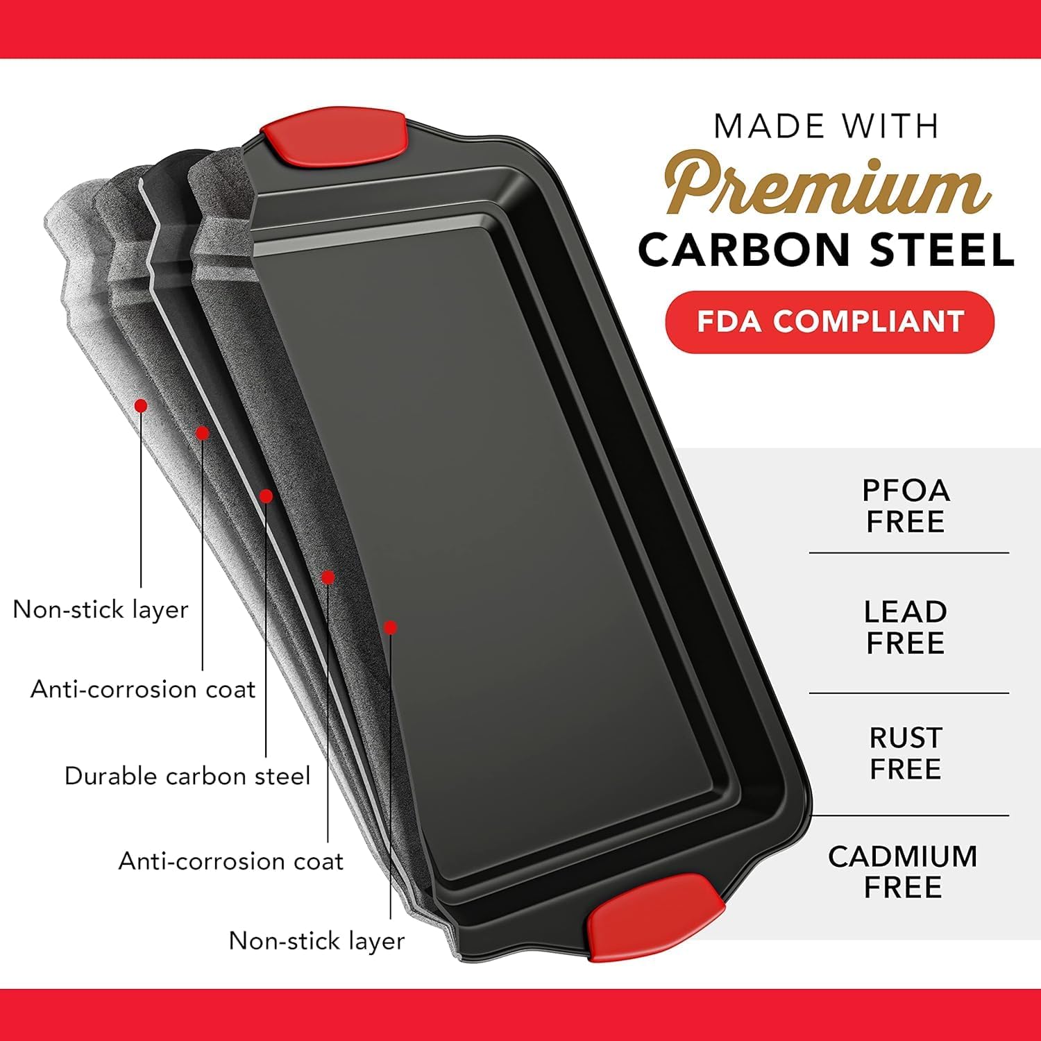 - Silicone Handles: Red silicone grips on our oven pan set ensure a solid, comfortable grasp. Our small, medium, and large cookie sheets for baking, nonstick set is BPA-free and PTFE/PFOA/PFOS-free.
