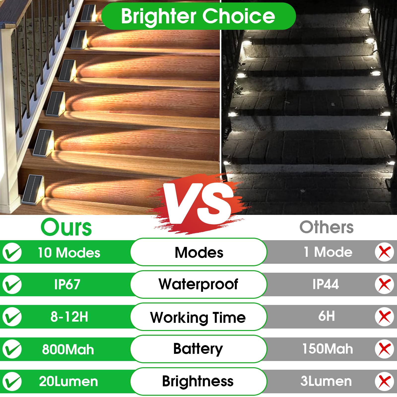 - Brighter US Patent Technology: Our solar step lights boast high-lumen LED, unique optical condenser cups, and high-transmission lenses, which combine to provide brighter and more distant illumination. Enhanced with large solar panels and batteries, these lights offer extended operation time