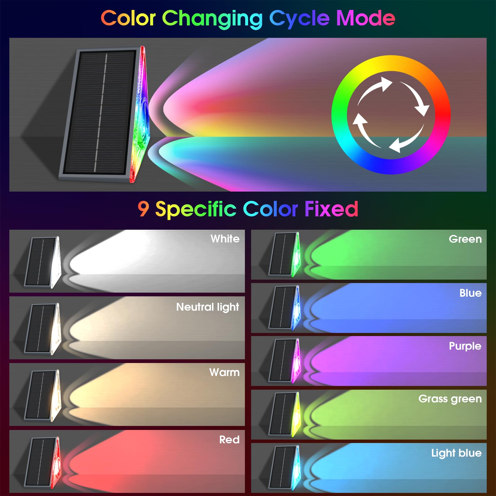 - 10 Light Colors Available: Choose from nine fixed colors (6000K, 4500K, 3000K, red, blue, green, purple, grass green, light blue) and a color-changing mode, totaling ten options. These solar lights are nice for everyday use, as well as special occasions like Halloween, Christmas, Easter, parties, birthdays, and weddings, providing the convenience of color adjustment to suit your mood or the occasion