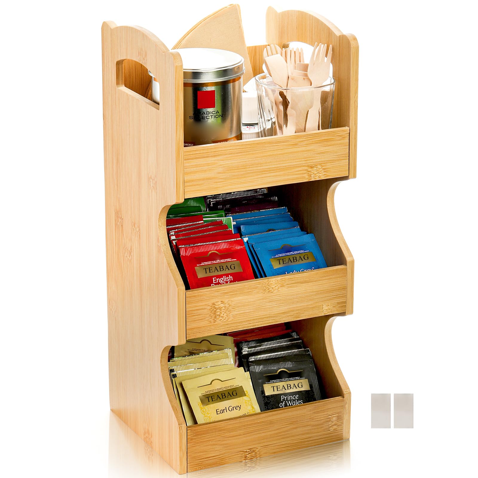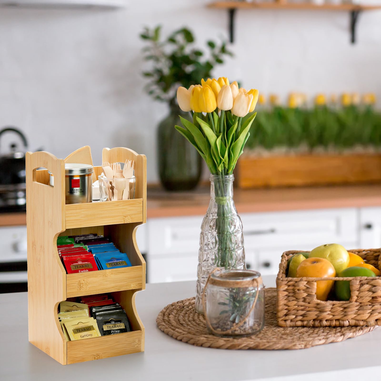 Foraineam Tea Bag Organizer Bamboo Coffee Condiment and Accessories Storage Holder, 3 Tier Teabag Shelf Coffee Pod Organizer Caddy Storage Box, Vertical Coffee Tea Packet Rack for Home, Office, Café