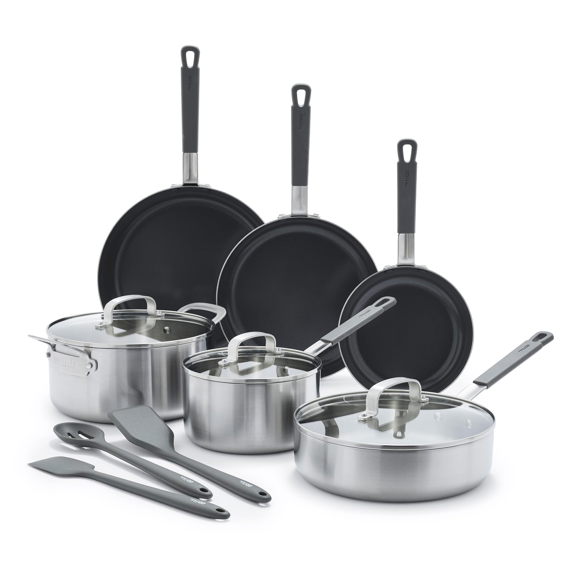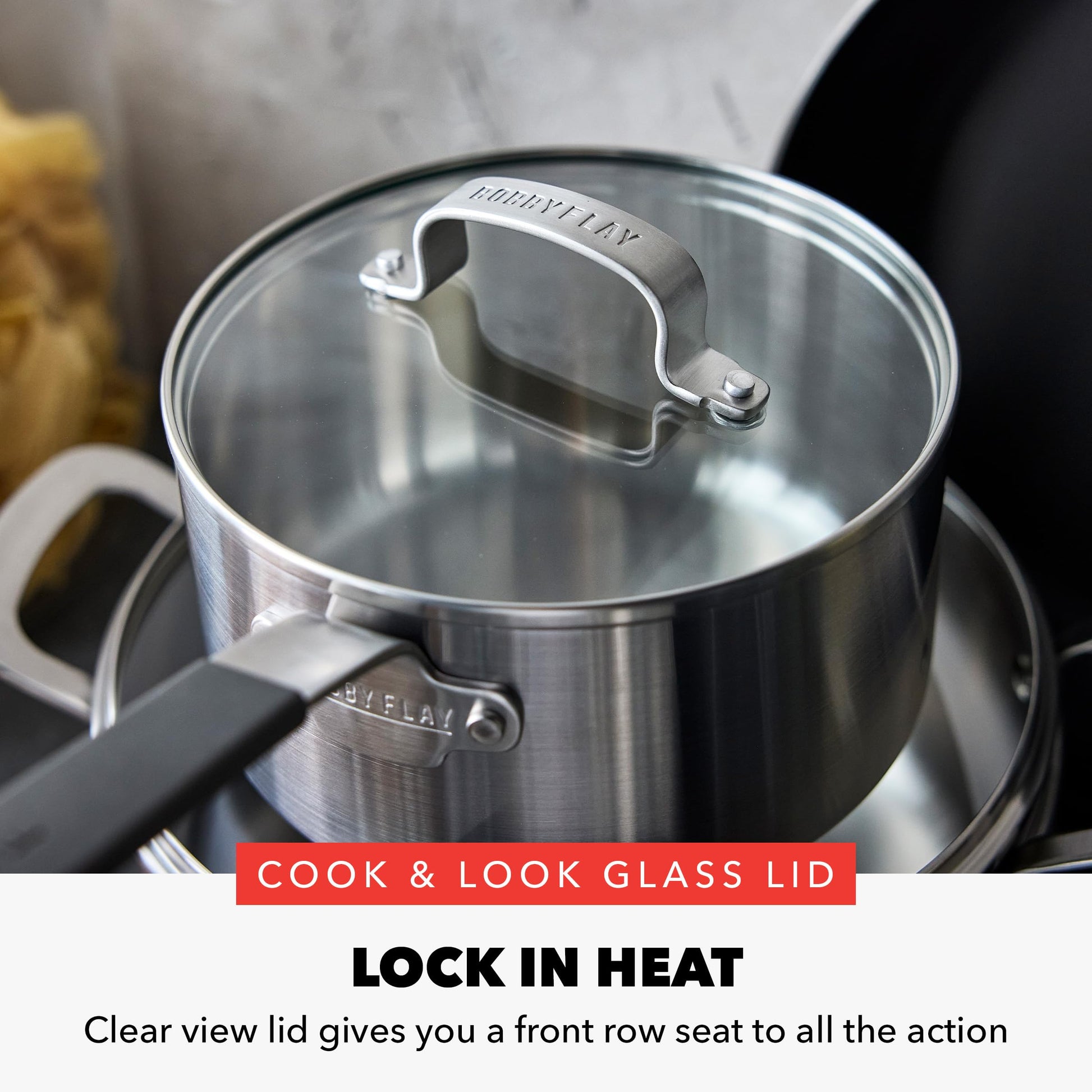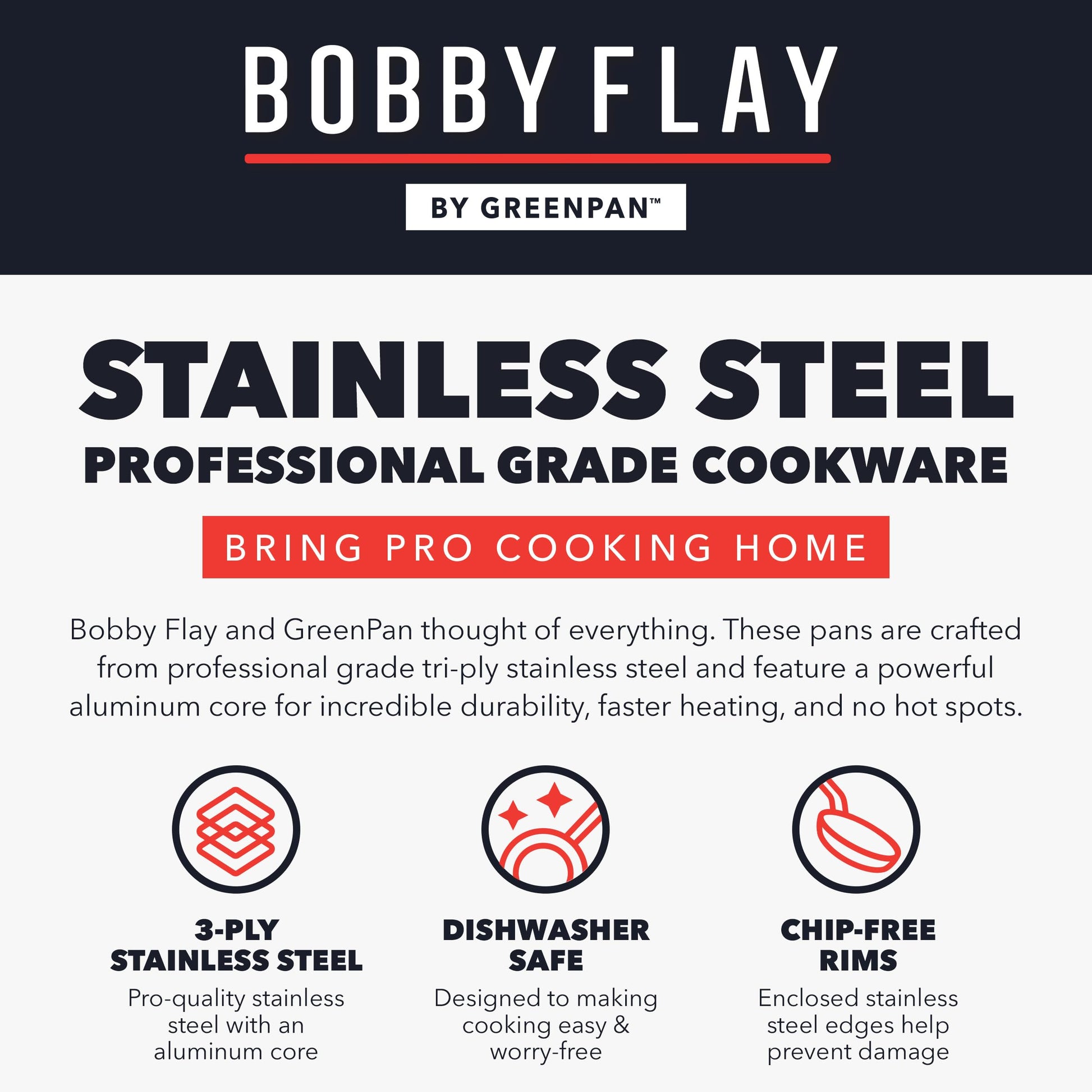 Details: World-renowned chef, TV host, restaurateur, and author Bobby Flay partnered with GreenPan to bring years of expertise and cooking innovation to this cutting-edge collection. Packed with thoughtful details that make cooking at home easier, this collection features the perfect blend of both worlds—uncoated 3-ply stainless steel and GreenPan’s PFAS-free nonstick frypans. Bobby Flay and GreenPan thought of everything. These pans are crafted from professional grade tri-ply stainless steel and feature a powerful aluminum core for incredible durability, faster heating, and no hot spots. This clad stainless steel collection is the best of both worlds. The uncoated stainless steel delivers amazing meals and each frypan is finished with GreenPan’s signature PFAS-free ceramic nonstick coating to make cooking worry-free.Each pan is packed with helpful details and GreenPan’s groundbreaking cooking technology. The generous chef handles stay cool to keep cooking comfortable so you can focus on flavor. Plus, the chip-free edges help prevent chips and dings to the coating on the PFAS-free nonstick frypans. Each tempered glass lid lets you keep an eye on your meal as you cook while the wide handles make each safe and easy to remove. Designed to deliver in any kitchen, this set is optimized for performance on all stovetops, including induction. The pans are oven safe up to 392˚F and dishwasher safe for effortless cleanup. This set includes: 8" PFAS-free nonstick frypan, 10" PFAS-free nonstick frying pan, 12" PFAS-free nonstick frying pan, 3QT sauté pan with lid, 2.54QT saucepan with lid, 5QT casserole with lid, silicone solid turner, silicone slotted spoon, silicone large spatula.