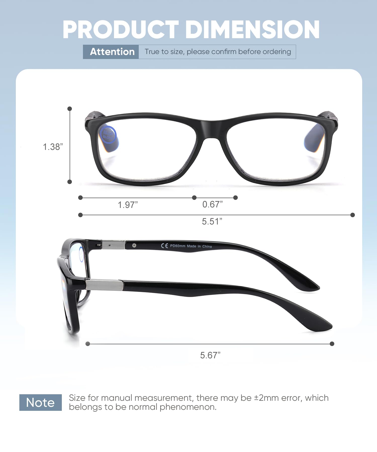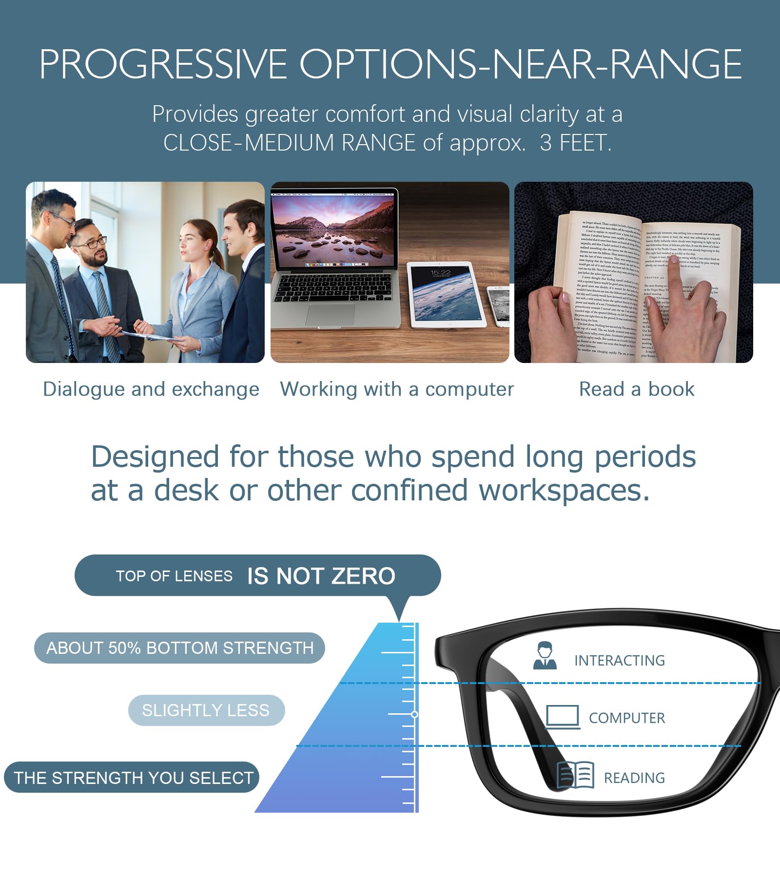- Multifocal Strength: No line trifocal glasses allows for multi-use, designed to provide great visual clarity and comfort for approx 3 FEET spaces; The top part of the lens is HALF bottom magnification you select, which is for daily communication/interaction; The middle part is slightly reduced transition strength for computer work; The bottom is the strength you choose for reading/writing, etc
