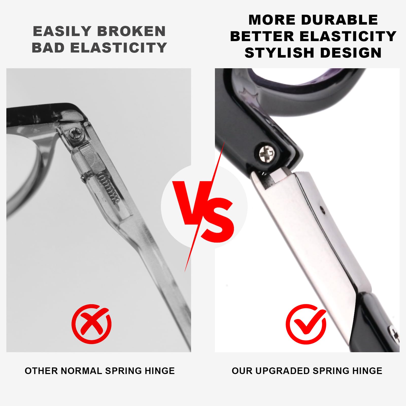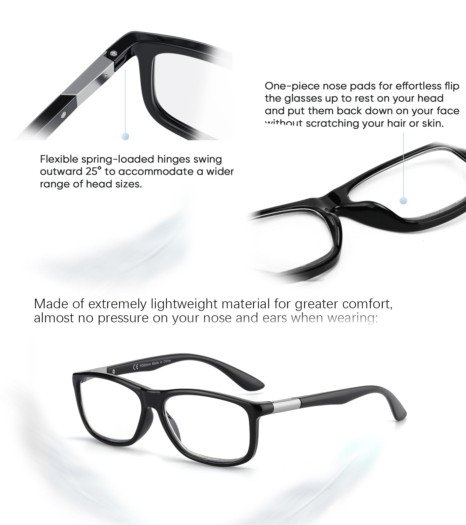 - Adjustable & Lightweight: Don't worry about your face shape can't fit the glasses! The glasses with flexible spring hinges can be extended outward by 25 °; The light TR90 readers sit gently on your ears and nose, delivering a pressure-less experience; Lighter and more durable than other glasses