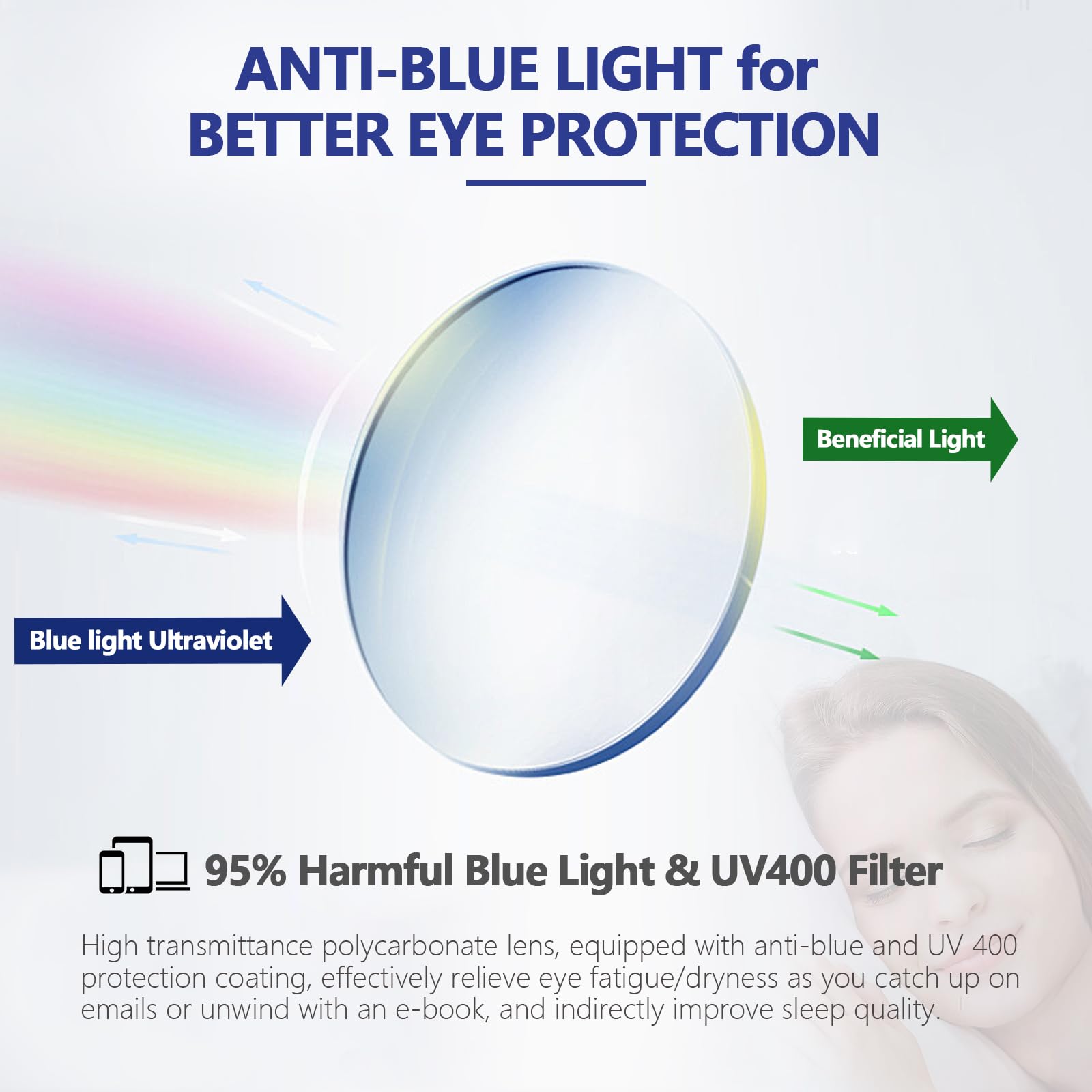 - HIGH TRANSMITTANCE & ANTI-BLUE LIGHT: High transmittance polycarbonate lens, clearer and more durable than normal plastic one; Features blu-ray blocking coatings which effectively filter harmful blue light and radiation, reduce screen glare, relieve eye fatigue/dryness as you catch up on emails or unwind with an e-book, and indirectly improve sleep quality