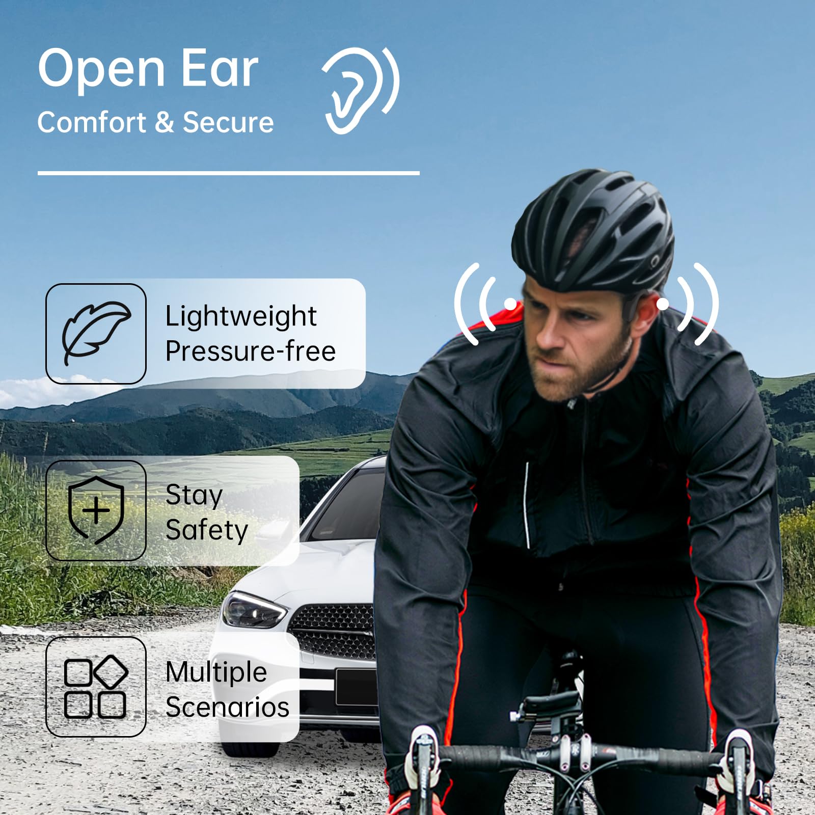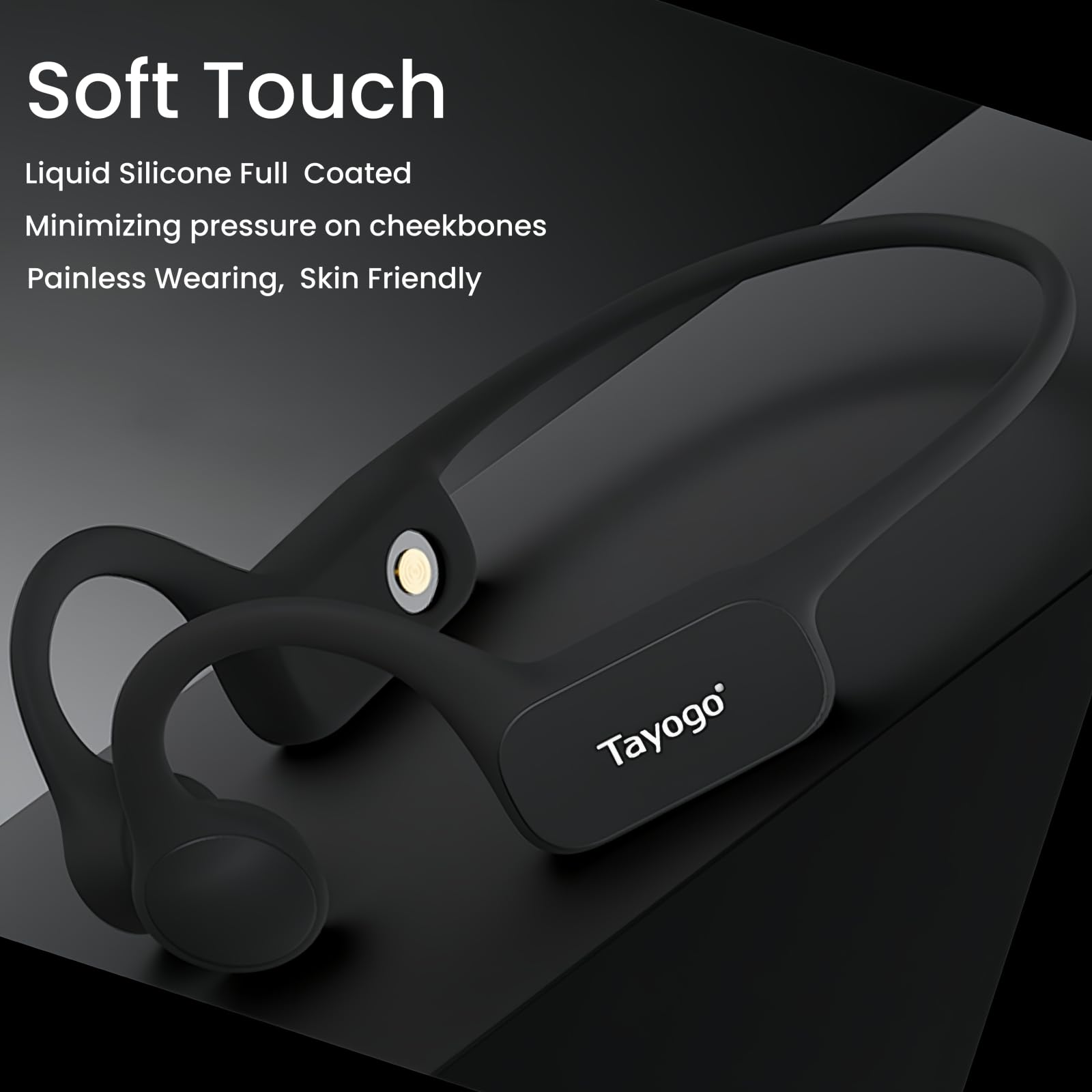 - 【Secure and PREMIUM Lightweight Construction】This open-ear headphones feature premium titanium alloy frame coated with patented, silicone-wrapped finish, what makes them exceptionally strong and resistent. The silicone finish offers a soft touch on the cheekbones, minimizing pressure,Integrates seamleassly with swim caps and goggles or sunglasses and bike helmets.